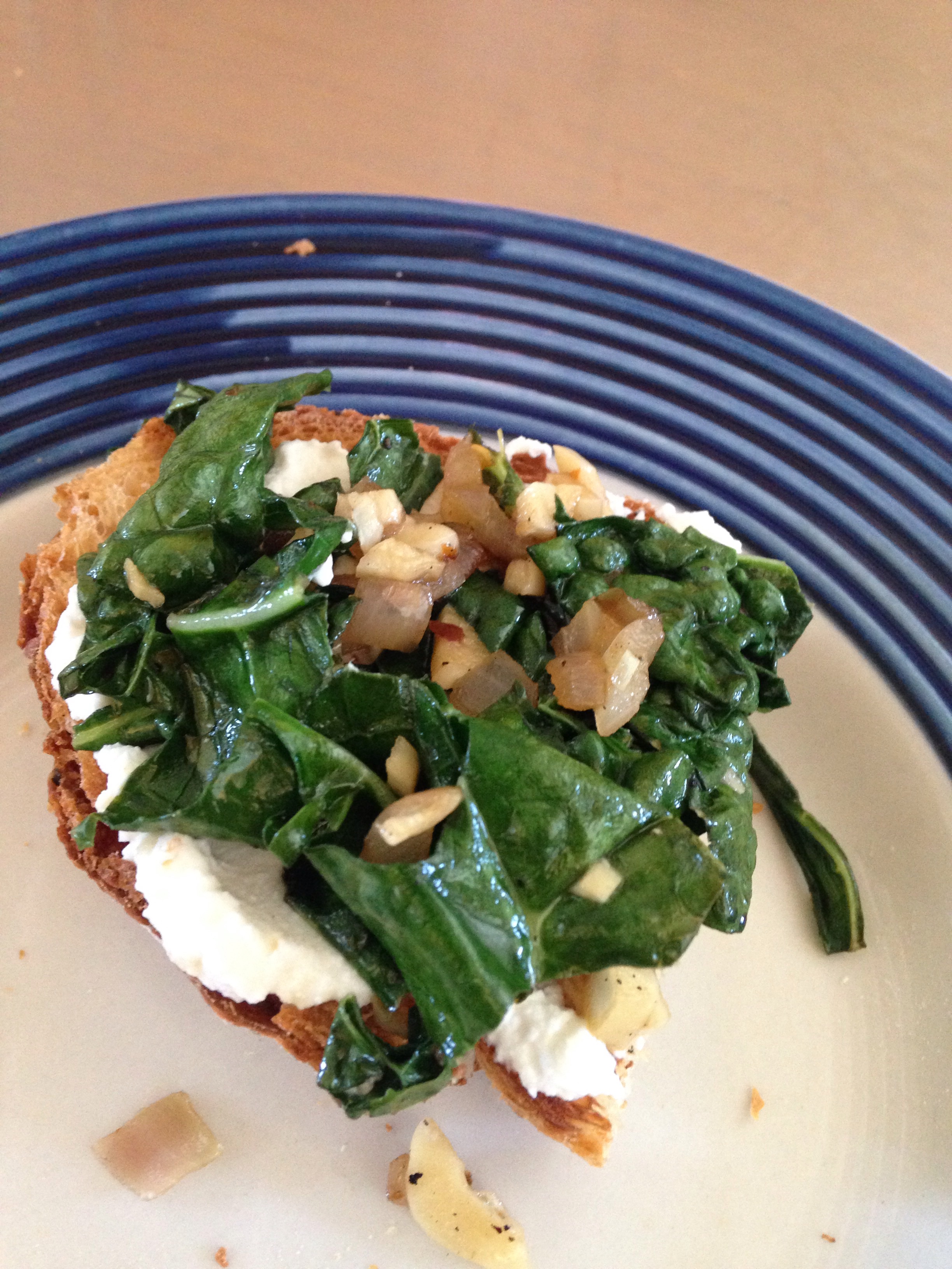 This yummy snack or light lunch could be varied in a million different ways.  Like subbing in avocado for ricotta if you’re dairy-free or vegan.  I loved both topping choices so we ate some of both.  I’ve also made something similar with smashed white beans and a touch of lemon juice added to the kale but no rice vinegar and then put it on dry toasted bread (no ricotta, no avocado).