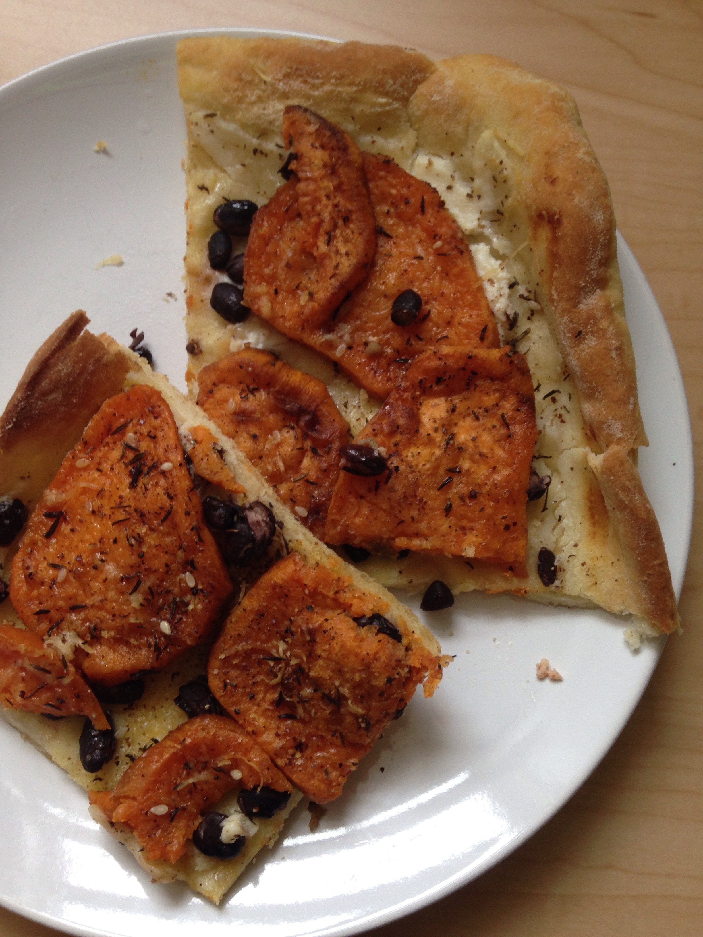 If you want to make the pizza in the top photo just buy (or make) some pizza dough, bake it for 8 minutes, put a good spread of ricotta on the half-baked crust, sprinkle some black beans on top and then the spiced sweet potato chips (and maybe a little extra salt or zatar or both). Add shredded Parmesan to your liking and then bake 8-10 minutes longer until crust is golden brown.