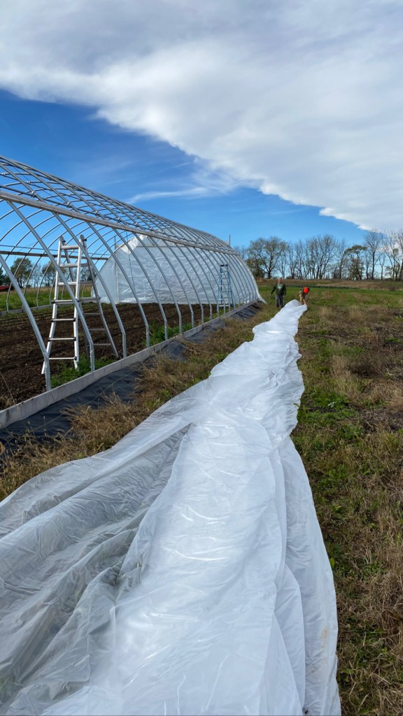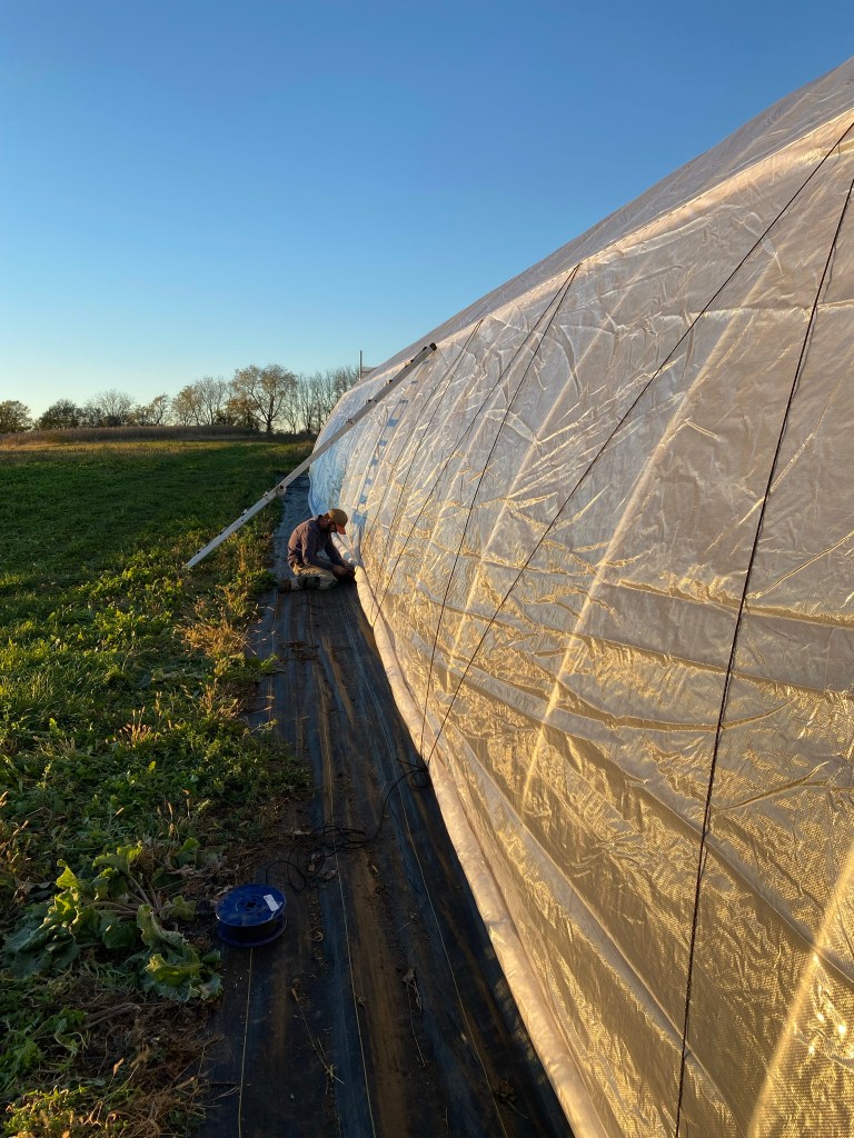 And by that I don’t mean we’ve done our last CSA delivery. No no, that happened a couple weeks ago. For us, the end of the growing season means that the garlic has been planted, the tomato trellis taken down, the hoophouse construction finished, and the landscape fabric rolled up. It means all the things that got put together to start the season have been taken back down or taken apart, and that every task that needed buttoning up has been buttoned.